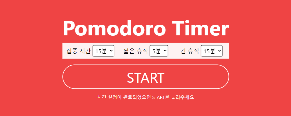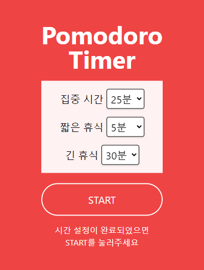 일단 제목을 크게 써서 보여주고, 가운데에는 셀렉트박스(selectbox)를 이용해서 집중 시간, 짧은 휴식시간, 긴 휴식시간을 설정할 수 있도록 화면을 구성하고, 아래 스타트버튼을 누르면 지정한 시간에 맞춰 타이머를 설정하고 실행하는 구조입니다.