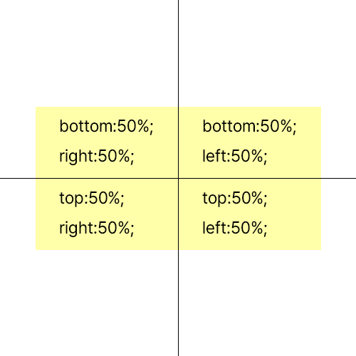 웹페이지에서 top, bottom, left, right를 이용해 위치를 지정할 때 모든 요소들의 기준점은 정중앙이 아니라 한쪽 귀퉁이를 말합니다, 따라서 50%를 쓰더라도 아래 이미지와 같이 정중앙에 위치하지 않게 됩니다.